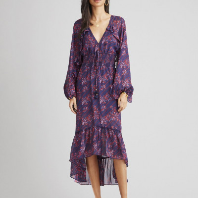 The Alessia Dress Is Back! Featuring Waterfall Ruffles Cascading From The Neckline To The Hem Of The Sleeves. The Feminine Finishes Continue In A Shirred High-Low Hemline, Delicate Tassel Tie Closure And A Vintage Indian Scarf Inspired Print. The Rich Color Palette Of Purple And Red Reflects The Inspiration Of The Season: Wild Things