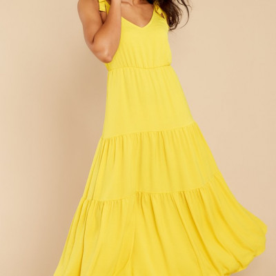 There are some days when you might want the attention your looks and charm can bring. But for the days when you’re on the hunt, there’s nothing quite like the right outfit to draw the right kind of attention. Lightweight dress features a double v-neckline, adjustable tie knot straps, an elastic waistline, and a gathered tiered maxi dress. Model is wearing a medium. • 100% Polyester • Hand Wash Cold • Unlined • Made in the USA
