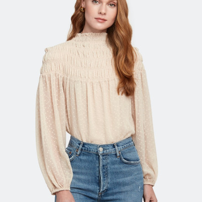 Airy and feminine, this blouse stands out with a smocked yoke and pretty balloon sleeves. Complement its billowy silhouette with your favorite high-rise jeans to achieve a chic, just-thrown-together look whenever. Materials: 100% polyester