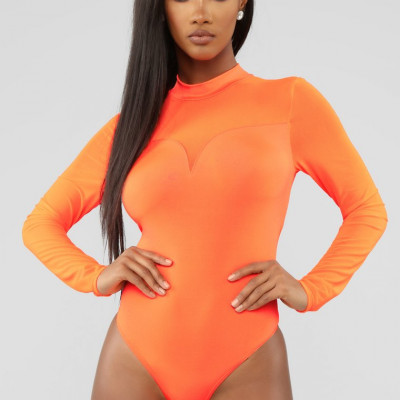 Available In Neon Orange, Black, And White Mock Neck Mesh Sleeve And Yoke Thong Bottom Snap Button Closure Shelf: 95% Polyester 5% Spandex Contrast: 91% Nylon 9% Spandex Made In Usa Final Sale