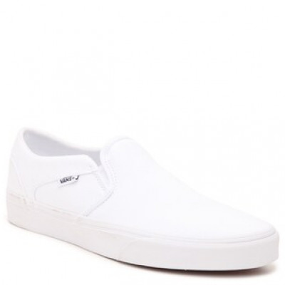 Flaunt classic style with the women's Asher slip-on sneaker from Vans. These versatile white kicks will be easy to pair with anything in your wardrobe! Item # 461649 UPC # 192364354414 FEATURES Canvas upper Slip-on with dual elastic gores Round toe Fabric lining Cushioned footbed Vulcanized midsole Signature rubber waffle sole Imported