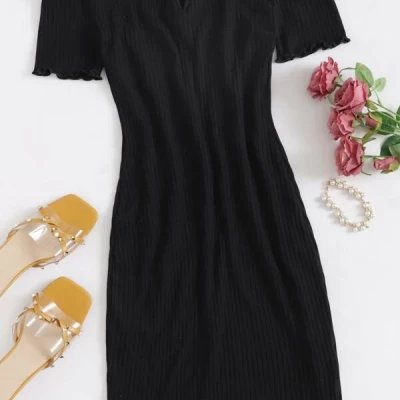Color: Black Style: Casual Pattern Type: Plain Neckline: Off the Shoulder Length: Short Type: Bodycon Details: Lettuce Trim, Rib-Knit Sleeve Length: Short Sleeve Sleeve Type: Regular Sleeve Season: Summer Composition: 5% Spandex, 95% Cotton Material: Cotton Fabric: Slight Stretch Waist Line: Natural Sheer: No Hem Shaped: Pencil Fit Type: Slim Fit