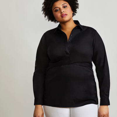 We see your work button-down and raise you something better. Meet The Tie-Waist Shelter Shirt. Professional and chic, this seasonless shirt includes cascading buttons that give way to a waist-cinching wraparound tie. The design is slightly longer in the back with a step hem side slit for a touch of hip. You don't need to work on the weekends, but the Shelter Shirt will (just add jeans). Materials: 95% cotton, 5% spandex