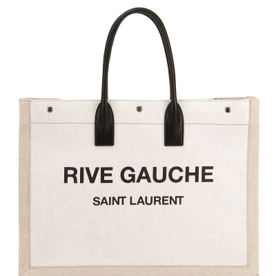 Saint Laurent canvas tote bag with leather and stud trim. Rolled top handles, 6.7 drop. Open top with triple snap closures. Exterior, logo at center front. 14.2H x 18.9W x 6.3D. Noe is made in Italy.