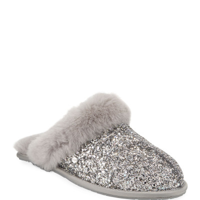 Glittered UGG slippers, featuring 17mm dyed sheepskin (USA, UK, Ireland, Spain, or Australia) collar, lining, and insole. Molded rubber outsole for indoor/outdoor wear. Finished with satin binding. Round toe. Slide style. Scuffette II Cosmos is imported.