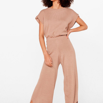 Womens Place Your Sets Waistcoat Top and Pants Set - Brown - S - Winner takes it all. The tank top comes in knit and features a relaxed silhouette, crew neckline, drop sleeves, and ribbed edges. The matching pants feature a high-waisted, wide-leg silhouette, elasticized waist, and slits at sides.