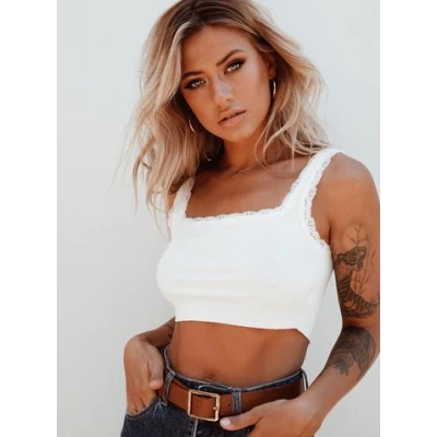Crop top Princess Polly exclusive Lace trimming Ribbed material Straight neckline Fixed straps Raw cut hem Unlined Cotton polyester blend Casey is wearing a size AU 6 / US 2 @gracieeelawrence is wearing a size AU 6 / US 2