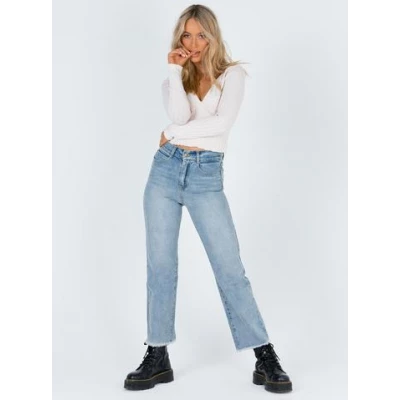 Denim jeans High waisted fit Relaxed leg Contrast stitching Frayed hem Belt loops at waist Classic 5 pocket design Zip & button fastening 100% cotton Length of size 8 waist to hem: 96cm / 37.7 Beth is wearing a size AU 8 / US 4