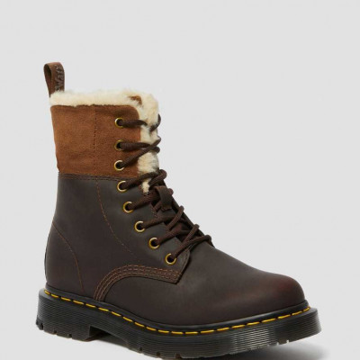 Get winterized. The faux fur-lined 1460 Kolbert women's boot combines original Docs DNA with high-performance protection against cold weather, including our newest innovation: our DM's WinterGrip sole. Built with grooved cleats with superior traction, grip and durability for solid footing on slippery surfaces, DM's WinterGrip is ideal for snowy days. Even better: the boot's made with Snowplow, a grit-and-salt-resistant, water-resistant leather that's easy to clean. .Faux-fur-lined, to keep feet snug in cold weather .Original 8-eye silhouette, with a fold-down option, exposing a luxurious faux fur lining .High-performance DM's WinterGrip sole, a PVC/Rubber/hybrid sole built with grooved cleats with superior traction, grip and durability on slippery surfaces .Made with Snowplow, a grit-and-salt-resistant, water-resistant and easy-to-clean version of our classic Crazy horse leather: oil-finished, rugged and distressed .Secured with a tough, hardwearing Goodyear welt .Made with all the classic Docs DNA, with grooved edges, visible stitching and a heel-loop featuring embossed rubber .Learn more about our Wintergrip styles Construction Goodyear Welted
