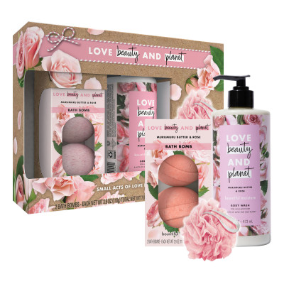 At Love Beauty and Planet we are committed to acts of love that make you and our planet a little more beautiful, every day. Our goal is a carbon footprint so small it's like we weren't even here. We started our journey by loading our beauty products with goodness. Every one of our cartons is recyclable. Our rose body wash is made with no sulfate cleansers, no parabens and is infused with plant-based cleansers, leaving you and the planet a little more beautiful. Give your skin a fragrant kiss of nature that lasts with handpicked Bulgarian Rose, ethically sourced from the Rose Valley of Bulgaria. How to use? You know itâ€â€pump, lather, rinse. Remember to go easy on the tap! Pamper yourself with our Bountiful Bouquet Bath fizzy! Our Murumuru Butter and Rose Bath Bombs are made with organic coconut oil for skin, no dye, no parabens and are cruelty-free, leaving you and the planet a little more beautiful. With our bath bomb ingredients, you can enjoy a fragrant bath with lush Amazonian Murumuru Butter and sweet scent of handpicked Bulgarian Rose, ethically sourced from the Rose Valley of Bulgaria. How to use your fragrant bath bombs? Fill your bath tub with warm water, unwrap the bath bomb, and drop it in your tub for some fizzy fun. Soak in and let the delightful scents take you away. At Love, Beauty and Planet, we are starting a beautiful movement. Are you in? Love Beauty and Planet Spa Body Gift Set Vegan, Certified Cruelty Free, No Parabens, Sulfate Free Body Wash & Bath Bomb Rose & Muru Muru, 2 Count .Love Beauty And Planet Spa Body Kit: Love Beauty & Planet Bountiful Moisture Body Wash and Love Beauty and Planet Murumuru Butter & Rose Bath Bomb .Bountiful Moisture rose body wash helps to maintain skin’s natural moisture, while helping to soften and smooth dry skin. .Love Beauty & Planet’s Bountiful Moisture body wash nourishes the skin, leaving dry skin petal soft and delivering an intensely feminine and refreshing ambiance in your shower. .Our Bountiful Bouquet Bath Bombs are infused with Organic Coconut Oil for skin. .Soak up with our bubbly bath bomb that has lush Amazonian Murumuru Butter and rich scents of handpicked Bulgarian Rose. .Our Spa Body Kit is the perfect gift for any occasion. Give as a Christmas gift, Anniversary gift, or Birthday gift to your loved one. Specifications Number of Customer Ratings 1 Gender Unisex PPU Quantity of Units 1.0000 Each UPC 055086008433 Product Name ($15 Value) Love Beauty and Planet Rose & Muru Muru Spa Body Holiday Gift Set (Body Wash, Bath Bomb x 2 with Bonus Pouf) 2 Ct Manufacturer Unilever Price Per Unit UOM Each Brand Love Beauty and Planet