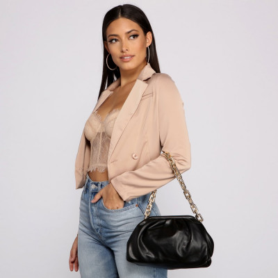 Create A Head-Turning Statement In A Crossbody That Brings The Chic Factor To Your Look! The Crossbody Features A Large Rounded Body With Scrunched Detailing, Chunky Chain Link Handles And Composed Of A Faux Leather Material. Complete Look With A Long Sleeve Mini Dress And Mules. Fit & Features Large Rounded Body Scrunched Detailing Chunky Chain Link Handles Detachable Shoulder Strap Faux Leather Material