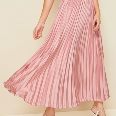 Style: Elegant Color: Pastel, Dusty Pink Pattern Type: Plain Length: Maxi Type: Pleated Details: Pleated, Zipper Season: Spring/Summer/Fall Composition: 100% Polyester Waist Line: High Waist Material: Satin Fabric: Non-Stretch