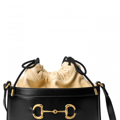 Inspired by an archival design, this leather bucket bag showcases the horsebit-an equestrian detail that has remained a constant house code for over six decades. The soft drawstring top and structured base create a modern play on texture and shape. Style Name: Gucci Small 1955 Horsebit Leather Bucket Bag. Style Number: 5957462. Available in stores.