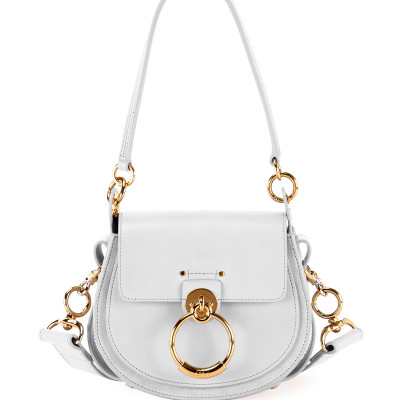Chloe crossbody bag in calf leather and suede with ring ornament detail. Top handle with rings. Removable shoulder strap. Flap top with magnetic closure. Cotton lining. 6.9H x 8.1W x 2.4D. Made in Italy.