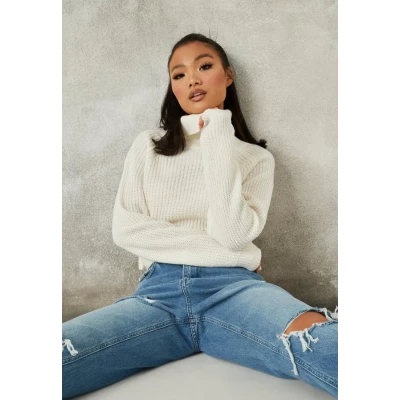 a cropped sweater with roll neck and batwing sleeves. regular fit crop - sits at the waist 100% acrylic carmen wears a UK size 6-8 / EU size 34-36 / US size 2-4 and her height is 54