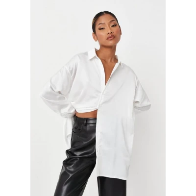 white button front shirt in a satin fabric and extreme oversized fit. this is a super oversized shirt.if you want it to be more fitted we suggest you go down a size or two! extreme oversized fit Long Length - Covers the bum 100% Polyester domenica wears a UK size 8 / EU size 36 / US size 4 and her height is 58