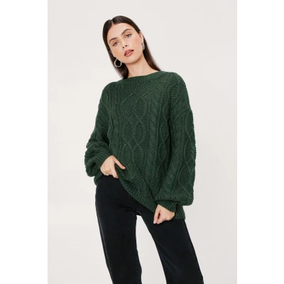 Womens Chunky Cable Knit Jumper - Green - S - Lets get to it. This sweater comes in a chunky, cable knit and features a crew neckline, relaxed silhouette, drop, balloon sleeves, and ribbed edges.