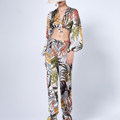 Designed with romanticism in mind, the wild palm print Bacia crop top captures femininity and fantasy. This top feature voluminous sleeves that is subtly gathered at the shoulder and finished a smocked trim at the cuff. The deep V neckline elegantly frames the chest and the smock trim below the bust allows the silky top to naturally blouse. Style the Bacia Top with the Pascale skirt or Cheyenne Pant for a complete romantic look