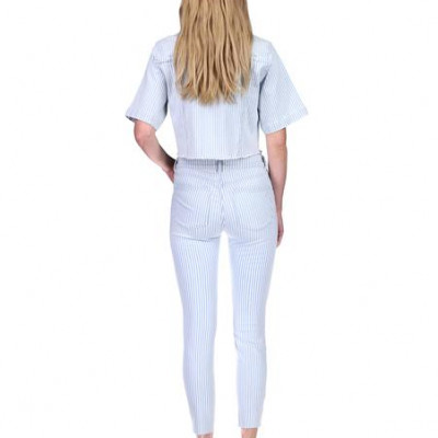 Vika is a shrunken denim jacket that tapers through the waist and falls at the hips. This classic fit will pair perfectly with anything in your wardrobe. Teramo is a washed down blue railroad stripe with a raw hem.