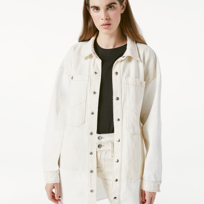 With a modern utilitarian feel, this shirt jacket is cut from a recycled stretch cotton blend for an oversize fit and features sleek brushed hardware for a polished effect. Go tonal by styling yours with vintage white denim or as a third-piece layer atop a button-down or knit. .88.06% Cotton/8.38% Re-used Cotton/3.56% Recycled Polyester .Machine Wash .32.5" Long From Shoulder Model is 5'10" Tall/177cm and is Wearing a US Size S/M Style: OSSJK171-VTWM