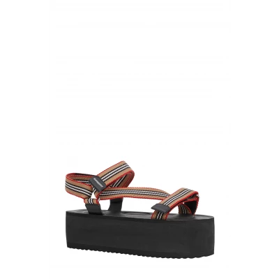 Hook-and-loop straps jacquard-woven with Burberrys Icon stripes highlight this fun, sporty sandal boosted by a waved platform sole. 2 1/4 (57mm) heel; 2 platform (size 39) Adjustable hook-and-loop straps Textile upper/textile and synthetic lining/synthetic sole Imported Womens Designer Shoes