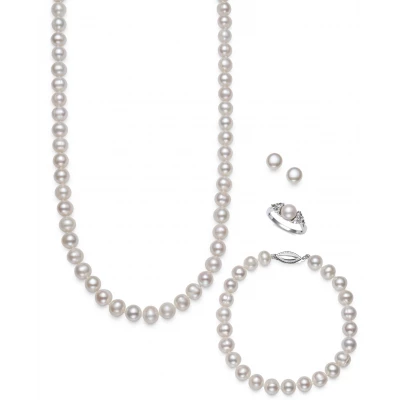 A classic essential. Belle de Mers jewelry set includes a beautiful cultured freshwater pearl collar necklace, bracelet and stud earrings, as well as a glittery cubic-zirconia-accented ring.