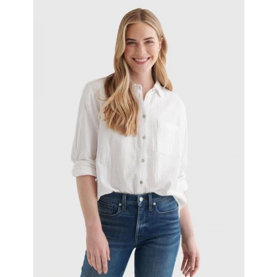 A crisp button-down doesnt need to be tailored for a polished look. This relaxed fit cotton-poplin shirt features a front chest pocket and classic button closures. Style yours under a lightweight sweater or tie the front hem for a cool cropped effect. Spread collar. Chest patch pocket. Long sleeves. Button cuffs. Curved hem. Button closure. - 100% Cotton - Relaxed-Fit Pocket Woven Shirt - Lucky Brand Womens Clothing Button Down Tops Shirts in Bright White