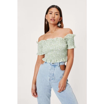 Womens Ditsy Floral Print Off the Shoulder Blouse - Green - 4 - Free the shoulders. This crop top features an off the shoulder, fitted, cropped silhouette, shirring throughout, ruffle detailing at hem, and ditsy floral print throughout. The perfect companion for your mom jeans. Model is 57 and wears a US size 6/UK size 10.