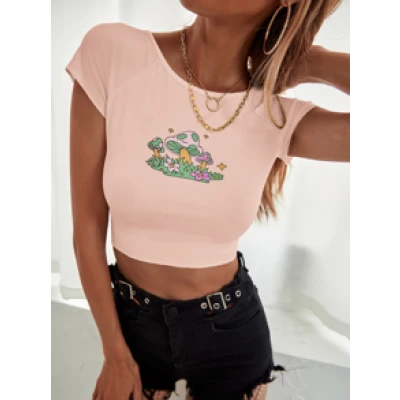 Pink Casual Short Sleeve Polyester Cartoon Medium Stretch Summer T-Shirts, size features are:Bust: ,Length: Crop ,Sleeve Length:Short Sleeve