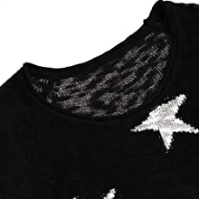 100% Acrylic Imported Pull On closure Lightweight star knitted sweater features a wide v-neckline Long raglan sleeves, and ribbed cuffs and hem V-neck is not revealing and can be pulled off of one or both shoulders Oversized tunic tops ideal to pair with shorts, jeans, leggings or trousers Lightweight, breathable and super stretch fabric