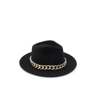 A standout chunky chain adds unique character to this classic fedora hat silhouette. Best worn with a statement fall coat for maximum effect! Gender: womens; Color: Black-Gold; Category: Women > Trends > Metal hardware