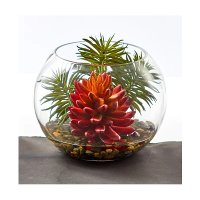 The 6-inch succulent artificial plant features a stunning mixture of dark and green thick succulent leaves. The arrangement is contained in a clear round vase that is small enough to fit on any surface with limited space. You can place it on a mantelpiece or wall-mounted shelf next to a series of plant terrariums to create a southwestern styled indoor garden in your home.