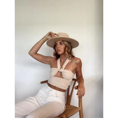 Knit multiway wrap top. Fully lined. Style #: 9824-10/2142-10 Material: Cotton/Polyester/Spandex Color: Nude Model is wearing a small MODEL STATS: Height: 5'4" / Bust: 32A / Jeans: 24