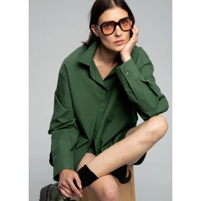 Color: Hunter Green Crisp Organic cotton shirting fabric Oversized fit Pointed collar Button front closure Single patch chest pocket Button cuffs Curved high-low hem Tonal logo embroidery 100% Organic Cotton Fibers GOTS Certified Machine Wash Cold By The Frankie Shop. Imported Product Measurements: XS- 19.5" Shoulder, 42" Bust, 27.5" Length S- 20" Shoulder, 44" Bust, 28" Length M- 20.5" Shoulder, 46" Bust, 28.5" Length L- 21" Shoulder, 48" Bust, 29" Length Model is 180cm/ 5'11" wearing size S