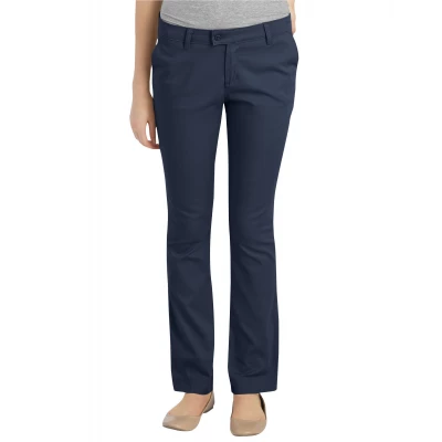 Sits slightly below waist; slim in seat and thigh; straight leg 7.3 oz. Twill, 98% Cotton/2% Spandex Stretch fabric for comfort and movement Contoured waistband Button-front closure Two slash-front pockets Two back-welt pockets Machine washable Dark Navy Imported Send your girl to school in extreme comfort with Dickies’ Juniors Schoolwear Slim Fit Straight Leg Stretch Pant. Made from 98% cotton with a little bit of stretch, this straight-leg pant is sure to keep her feeling good. Sitting slightly below the waist, this pant is slim in the seat and thigh for a more fitted look. The stretch fabric makes sure to move any way she moves, while the front and back pockets leave room for her daily must-haves.