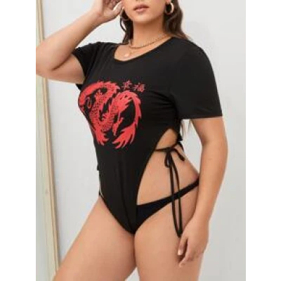 Black Sexy Short Sleeve Polyester Animal Tee High Stretch Summer Plus Size Bodysuits, size features are:Bust: ,Length: ,Sleeve Length:Short Sleeve