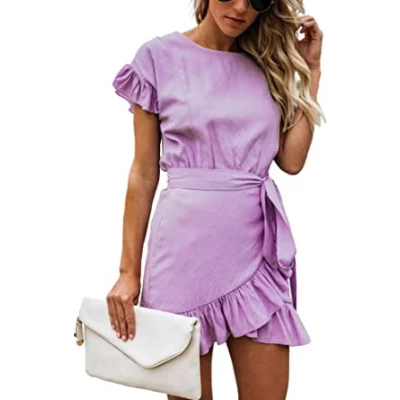 Relipop Women's Dress Solid Fishtail Short Sleeve Wrap Ruffle Hem Mini Short Dresses at Amazon Women’s Clothing store