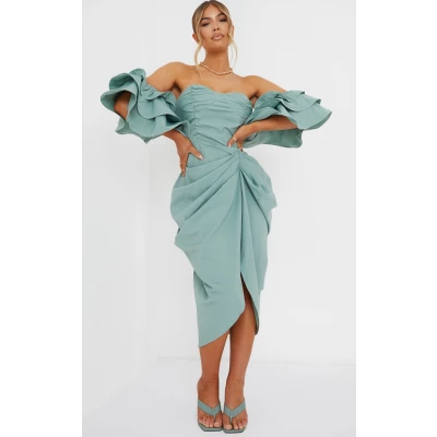 Sage Green Bardot Frill Sleeve Draped Midi Dress