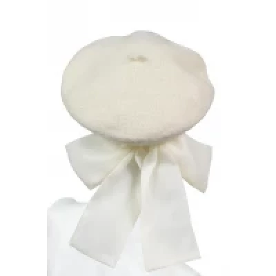 Off white Béret with matching handmade organza bow at the back. 100% wool beret, 100% organza bow. Beret beige avec noeud en organza fait à la main à l'arrière.