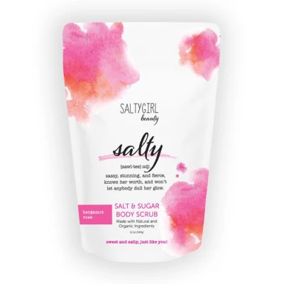 .SaltyGirl Salt and Sugar Scrub leaves your skin super soft with an exfoliating blend of moisturizing blend of oils & and blend of salt and sugar. .No Artificial Ingredients, Fillers, Parabens, Alcohol, Animal Ingredients, Fragrances, Sulfates, Artificial Colors, Or Unnatural Preservatives .Made In Small Batches In The USA .12 oz -Our scrub comes in a convenient pouch, a great alternative to glass jars that can slip and break in the bath or shower