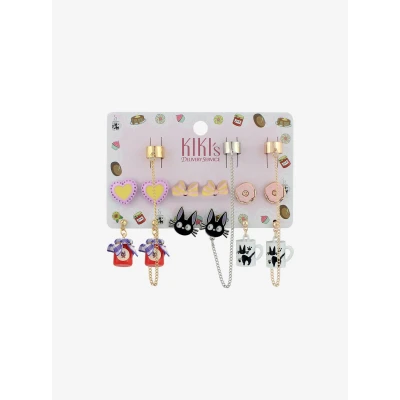 Everything the stylish witch-in-training needs. This set of stud and ear cuff earrings takes inspiration from the food and fashion of the Studio Ghibli classic, Kikis Delivery Service ! Youll get jam jars, bows, coffee mugs, donuts and more. Oh... and of course, Jiji!
