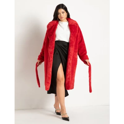 Faux Fur Notch Collar Coat Easy And Relaxed Fit Non Front Closure Faux Fur Polyester Hits At Below Knee Model Is 5'10" Size 14 Length On Model Is 46 1/2" 100% Polyester Care: Dry clean only CN Item# 1258221