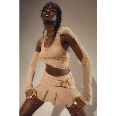 smocked textured jersey pleated mini skirt with attached belt & buckle matching crop top available belt detail mini length pleated fabric smocked jersey fabric part of a co-ord model is 5 ft 8 and wears a size uk 8 smocked textured jersey pleated mini skirt with attached belt/ buckle detail
