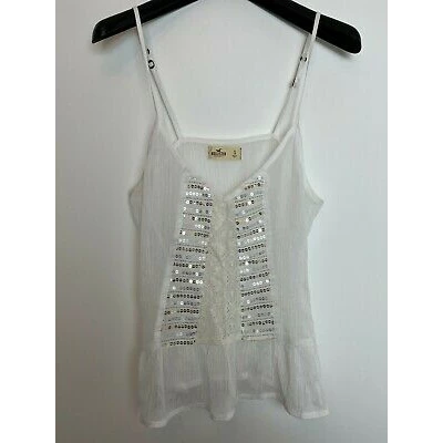 Item specifics Condition: Pre-owned: An item that has been used or worn previously. See the seller’s listing for full details ... Read moreabout the condition Size: S Character: na Accents: Straps, Sequin Colour: White Department: Women Style: Camisole Fabric Type: na Strap Type: Cami Season: Spring, Summer Material: Polyester Blend Theme: na Pattern: No Pattern Fit: Regular Type: Cami Features: Adjustable Strap, Collarless, Straps Vintage: No Neckline: V-Neck Closure: Straps Sleeve Length: Sleeveless Occasion: Casual Brand: Hollister Size Type: Regular