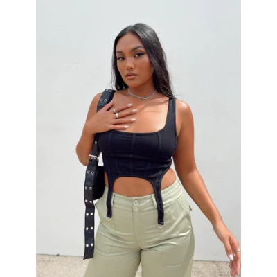 Crop top Slim fitting Princess Polly Exclusive Rheanna is wearing a size AU 10 / US 6 95% rayon 5% elastane Soft ribbed material Corset style Scooped neckline Garter strap hem Exposed zip fastening at back Hook & eye clip above zip Good stretch Fully lined