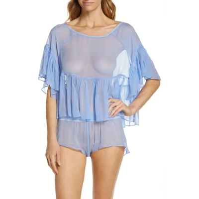 Slumber sweetly in this rich silk top framed by fluttering ruffles. 20 1/2 length Scoop neck Short sleeves 100% silk Machine wash, line dry Made in the USA of imported fabric Black Owned and Founded