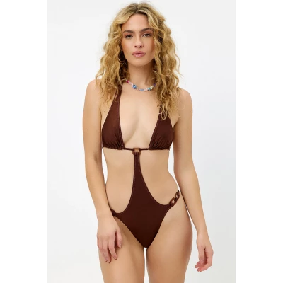 Can't seem to decide between a bikini and one piece swimsuit? You don't have to. Our brand new April monokini one piece swimsuit is all you could ever want and more. Featuring a sweet halter that ties around your neck and even sweeter hardware, April screams business in the front and party in the back! This hot new satin one piece swimsuit is brought to you in the color of the season, Bambi.