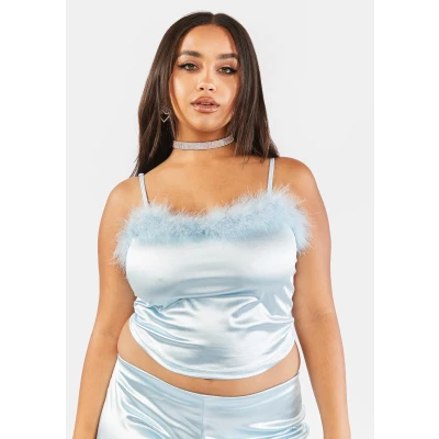 Sugar Thrillz Plus Cloudy Exes And Omgs Satin Tank Leave ‘Em In The Past, Babe! This Satin Tank Top Has A Cropped Fit, Adjustable Shoulder Straps, And Marabou Feather Trim. • Blue • Polyester Blend + Real Marabou Feathers • Hand Wash Cold, Hang Dry • Bottoms Sold Separately