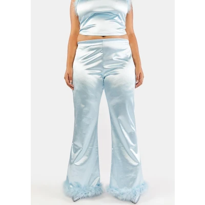 Sugar Thrillz Plus Cloudy Exes And Omgs Satin Pants Leave ‘Em In The Past, Babe! These Satin Flare Pants Have A High Waist Fit, An Elastic Waistband, And Marabou Feather Trim. • Blue • Polyester Blend + Real Marabou Feathers • Hand Wash Cold, Hang Dry • Top Sold Separately