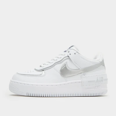 Double up your Swoosh style with these womens Air Force 1 Shadow trainers from Nike. In a White colourway with Metallic Silver accents, these classic sneakers have a layered leather and synthetic upper, with breathable perforations for cool comfort. They feature a padded ankle collar for a comfy fit, sat above a stacked midsole and encapsulated Air cushioning for lightweight cushioning. With an OG rubber tread for standout grip, these sneakers are finished up with Nike branding to the heel and